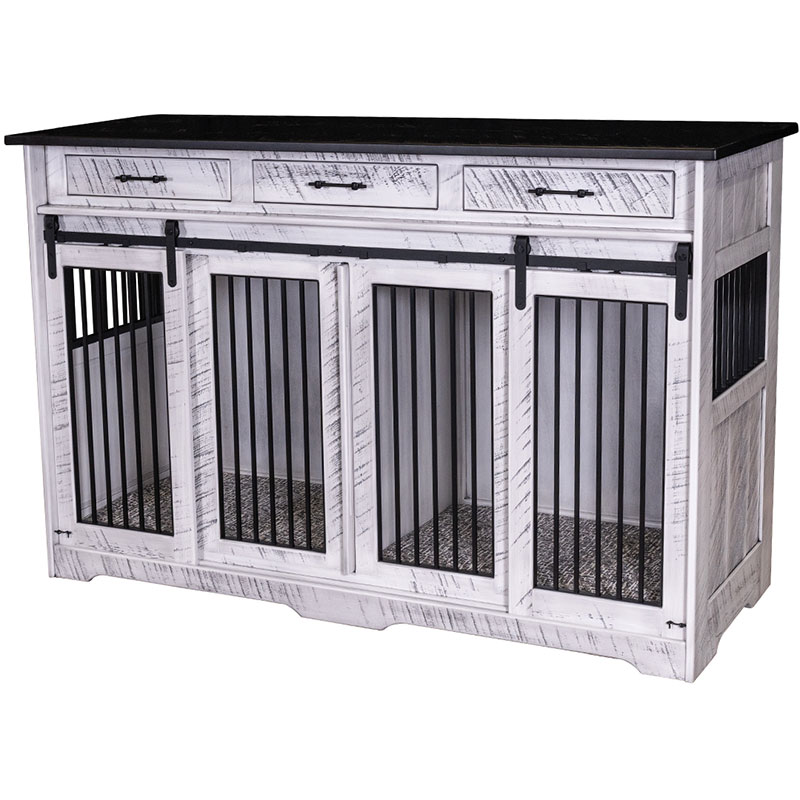Solid hardwood construction Powder coated aluminum slats Soft close barn door hardware Pads included - please select material below Designed to house two pets - center has removeable divider Each side has the interior dimensions of 33"Wx23"Dx34"H …